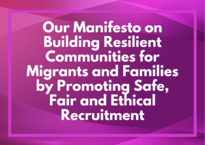 - Our Manifesto on Building Resilient Communities for Migrants and Families by Promoting Safe, Fair and Ethical RecruitmentIntroduction The Covid-19 pandemic rages on more than a year since it was declared a global pandemic in March 2020 by the World Health Organization… Read more: Our Manifesto on Building Resilient Communities for Migrants and Families by Promoting Safe, Fair and Ethical Recruitment