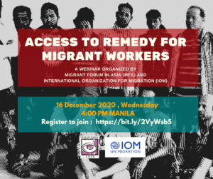 Migrant Forum in Asia in collaboration with the International Organization for Migration (IOM) is organizing a webinar on: Access to Remedy for Migrant Workers. The webinar will be held on Wednesday, 16 December 2020 at 4PM Manila time. Register and join us for the webinar! Register to join the webinar: https://bit.ly/2VyWsb5 Click here to check