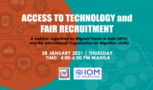 Migrant Forum in Asia in collaboration with the International Organization for Migration is organizing a webinar on Access to Technology and Fair Recruitment on 28 January 2021, Thursday, from 4:00-6:00 PM Manil. Please register in the link below to join the webinar: http://bit.ly/2LPmW6Q To check the time in your city please see: http://bit.ly/38IgqrC The influence