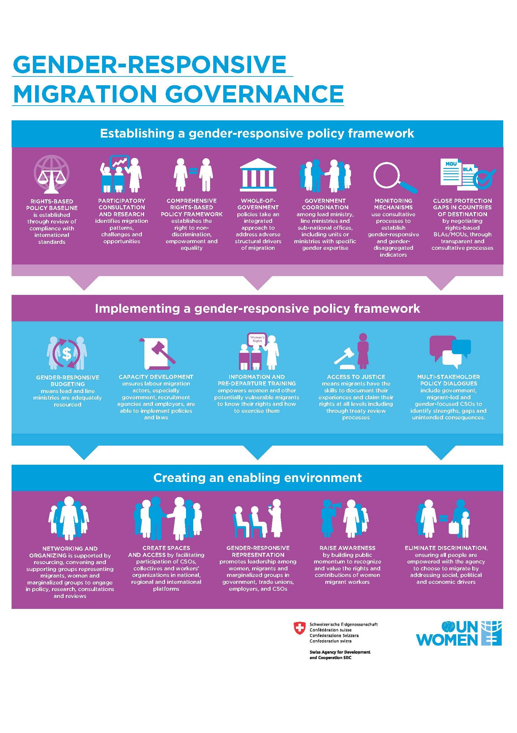 Each policy brief has an infographic providing models to implement the recommendations through gender-responsive migration governance, key protections for women migrant domestic workers’ employment contracts, and gender-responsive monitoring and accountability mechanisms.
